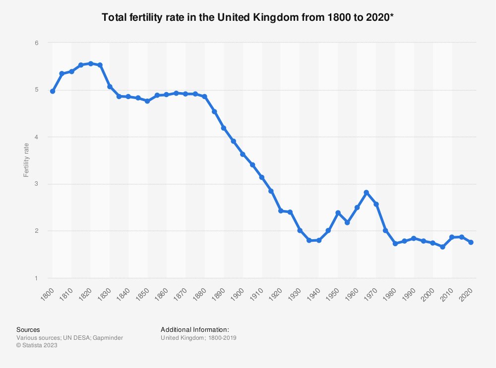 "Pomimo wzrostu dochodu, dzietność spadała przez większość dziewiętnastego wieku, w czasie, kiedy koszty dzieci rosły." Dlaczego w 2 poł. XVIII wieku dzietność w Anglii (na wykresie poniżej mierzona współczynnikiem reprodukcji brutto, czyli liczbą (1/10) #demografia_historia