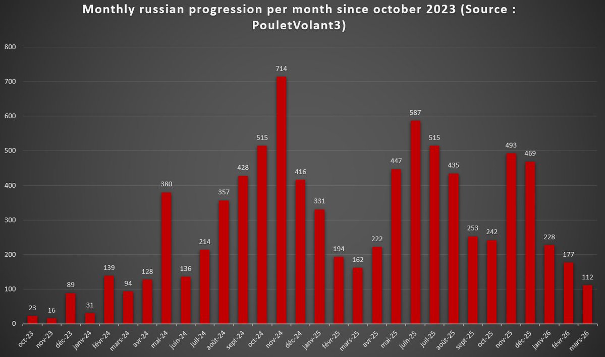 This month of march 2026 saw the smallest territorial progression of russian forces in Ukraine since april 2024.