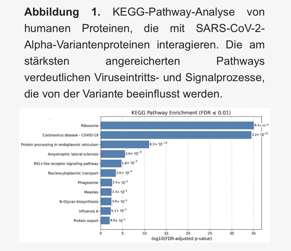 Vielfalt der gestörten biologischen Signalwege. Die Alpha-Variante interferierte vorwiegend mit Signalwegen der Immunmodulation und der Proteinbiosynthese, was mit frühen viralen Strategien zur Unterdrückung von Immunantworten und zur Manipulation der Translationsmaschinerie des