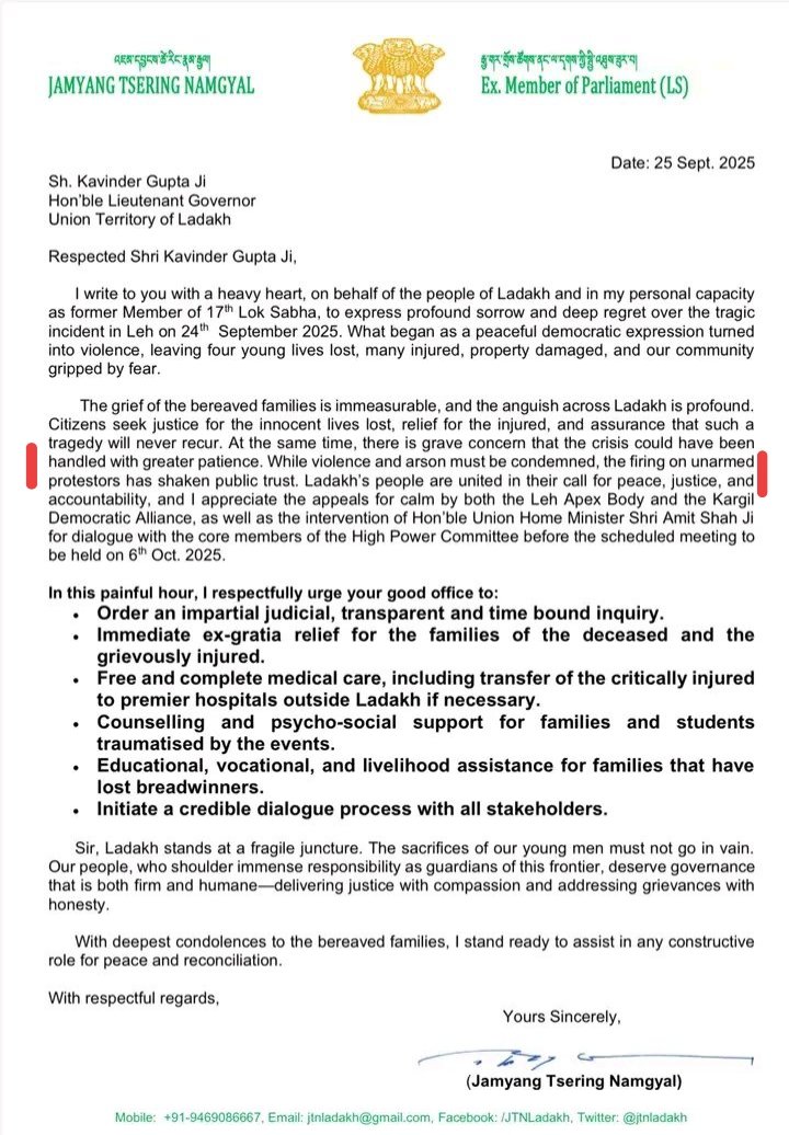 Jamyang Tsering Namgyal the Ex-BJP MP from Ladakh in his letter to LG Kavinder Guptaji said "Firing on unarmed people has shaken the public trust."