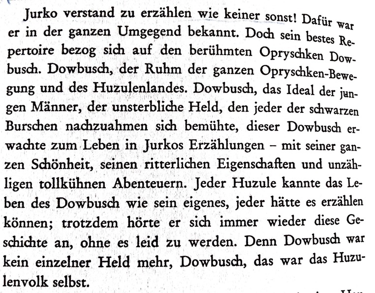 Einen bekannten huzulischen Opryschken-Roman schrieb z.B. der Ethnograph, Schriftsteller & Bandura-Spieler Hnat Chotkewytsch (1878 in Charkiw - 1938 hingerichtet): Der Roman heisst „Kaminna duscha“ 1911. Hier eine Stelle zum Dowbusch aus der deutschen Übersetzung: