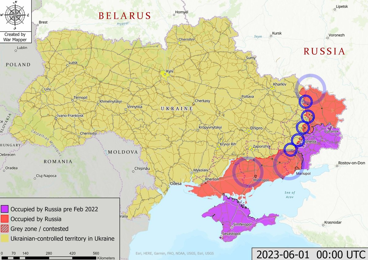 Die Intensität der Kampfhandlungen sank in den vergangenen Wochen insgesamt. Russland greift weiter Bachmut und Awdijiwka an. Sowohl im Nordosten bei Swatowe-Kupjansk und Kreminna-Lyman als auch weiter südlich bei Wuhledar zeigen sich aktuell nur wenig Aktivitäten. 2/