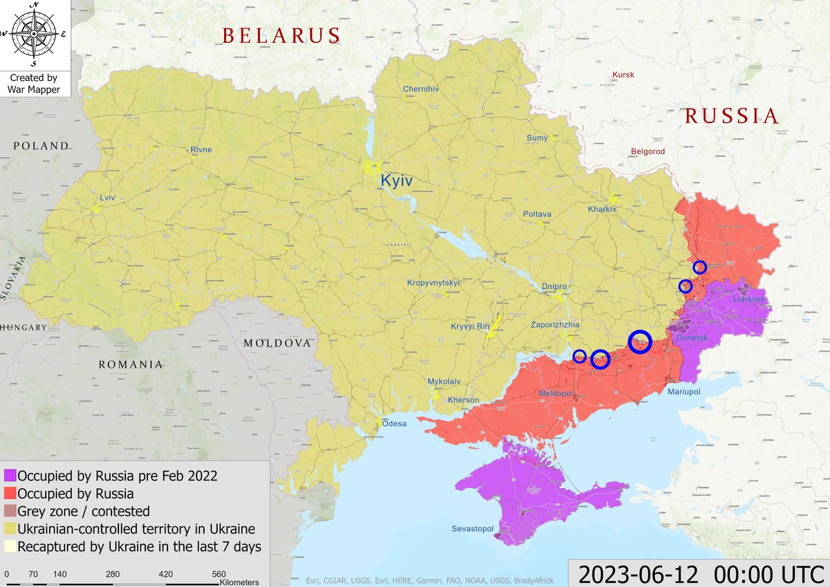 Die Ukraine stößt mit mehreren Angriffen gegen die russischen Verteidigungsstellungen vor. Die Ukraine greift vor allem nachts an, in kleinen Formationen aus Minenrollern, Schützenpanzern und Kampfpanzern. Erstmals sind moderne Schützen- und Kampfpanzer im Einsatz. 3/