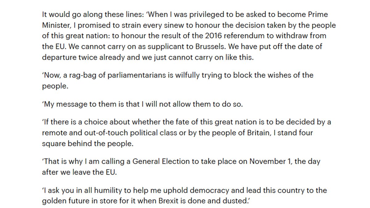 5. He even sketched out a speech Johnson could give to the nation, promising to "uphold democracy" against "a rag-bag of parliamentarians ... trying to block the wishes of the people".