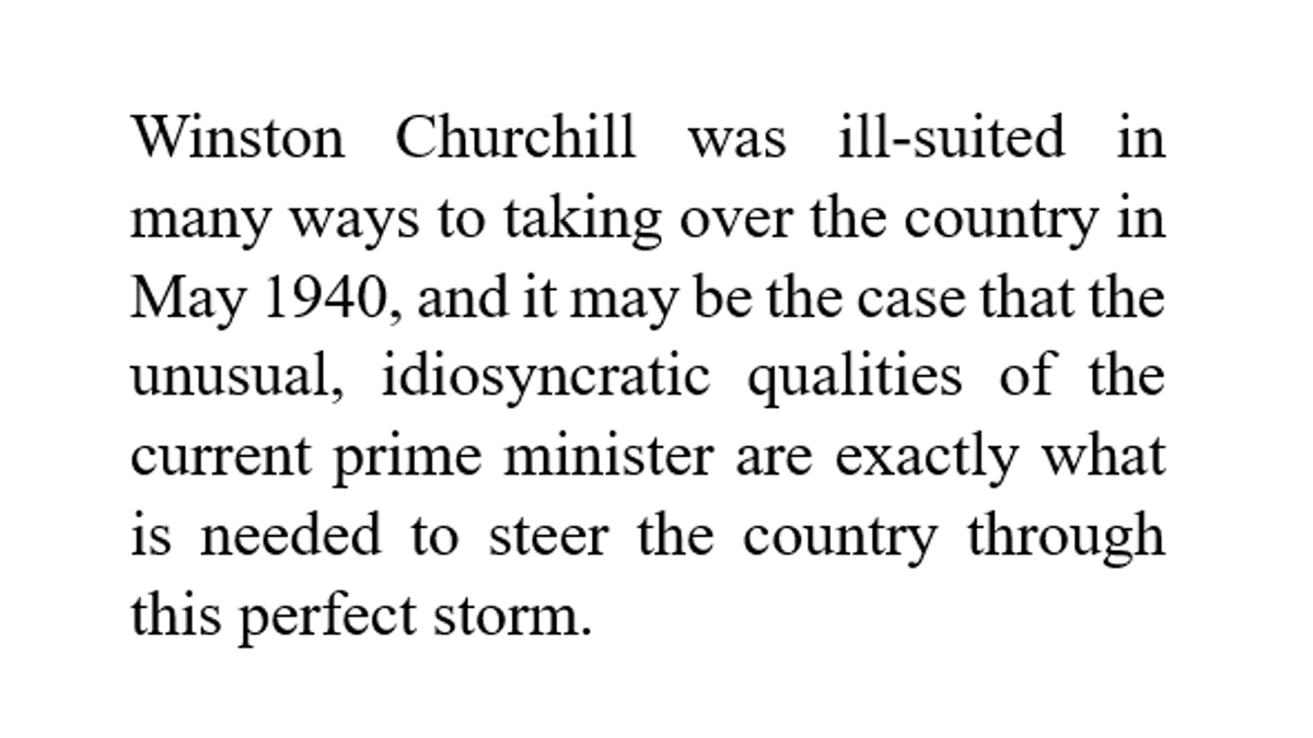 Johnson's "unusual, idiosyncratic qualities", he suggested, might be "exactly what is needed to steer the country through this perfect storm". thetimes.co.uk/article/what-w…