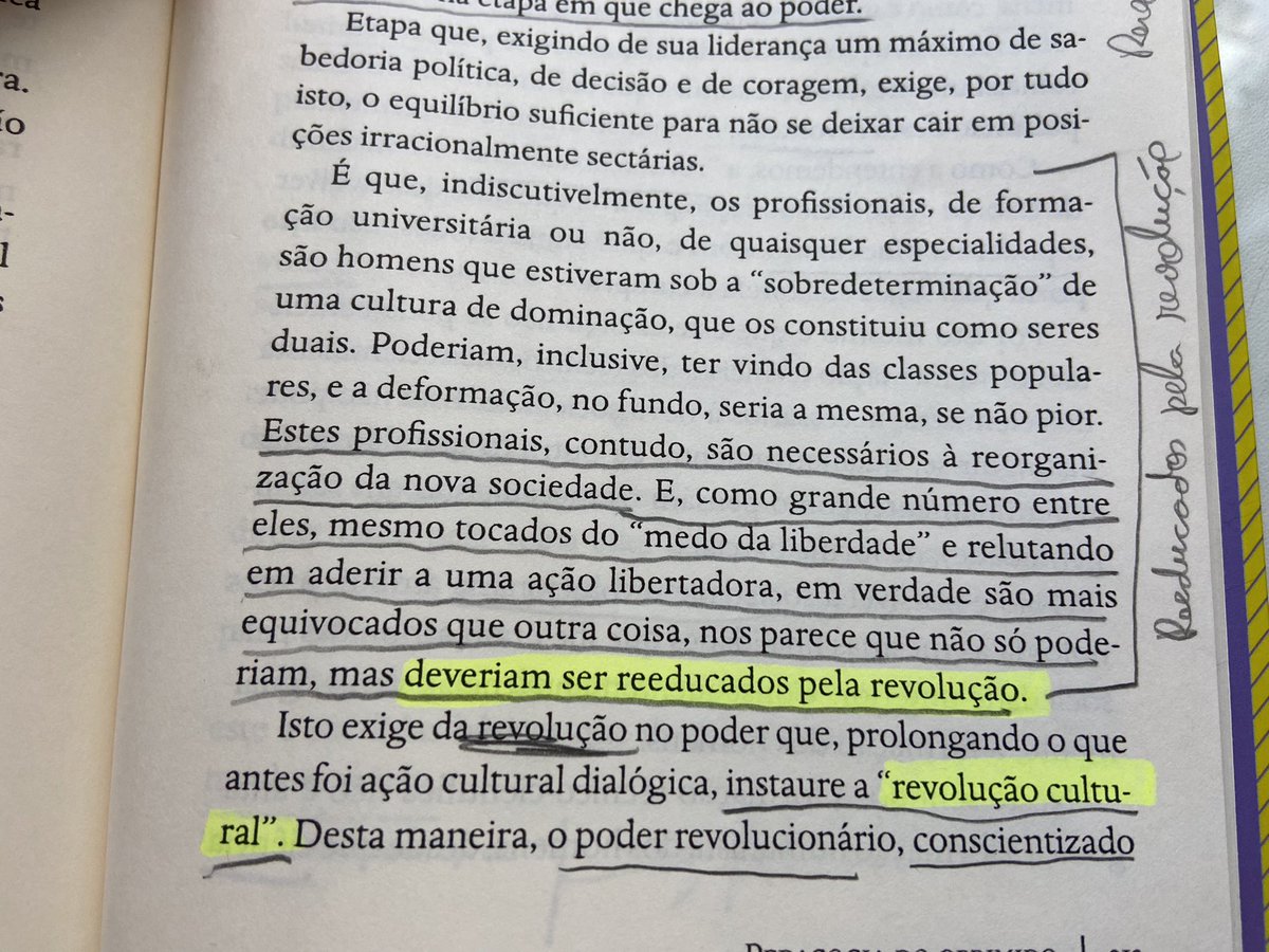 2/7 Na pag. 213, Freire prega “campos de reeducação” para os profissionais técnicos que são necessários. E ele diz isso dando a entender q esses profissionais não podem ser descartados: