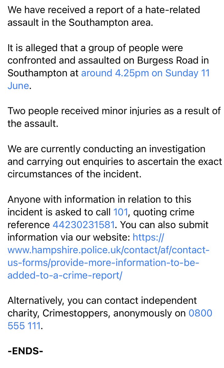 New: I spoke to one of the four victims of the Southampton attack. “John” was shocked by the attack, and was disappointed that no officers came after it. @HantsPolice say it’s a “hate-related assault” and are investigating