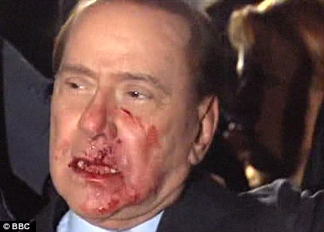 And he suffers a broken nose and two broken teeth at a political rally, when a bloke lobs a statuette of Milan cathedral at him.