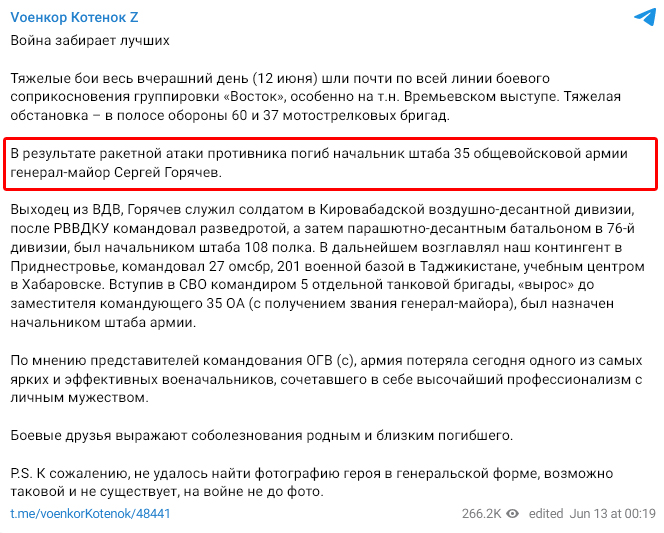Крупная шишка на ровном месте, начштаба #35оа генерал-майор Горячев Сергей Владимирович 1970 г.р. из подмосковного Ожерелья не успел насладиться новым званием, как 12/06/23 к нему в гости прилетела какая-то подлая ракета. И всё ru.wikipedia.org/wiki/%D0%93%D0…#всрф#потерьнет#груз200