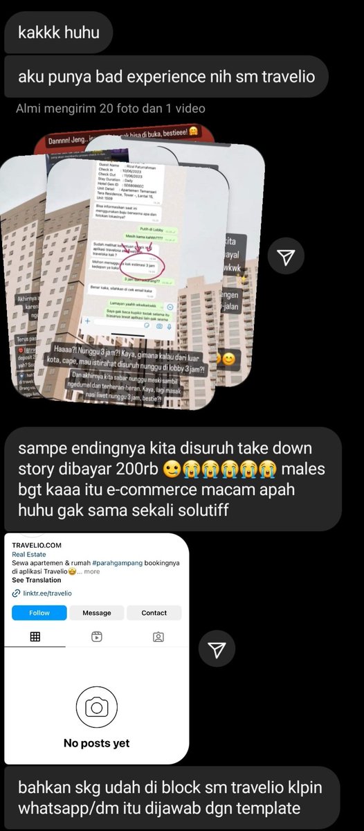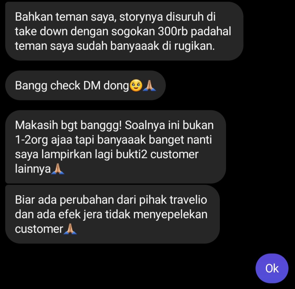 Min @TravelioSupport kalau costumer komplain kasih solusi lah jangan malah lo minta hapus komplain dengan imbalan duit 200 rebu buat mereka. Ini costumer kalian @TravelioSupport jadi ngadu ke gue karena komplain mereka di komen ig dihapus, yg komplain di-blokir, jadi gak ada… twitter.com/i/web/status/1…