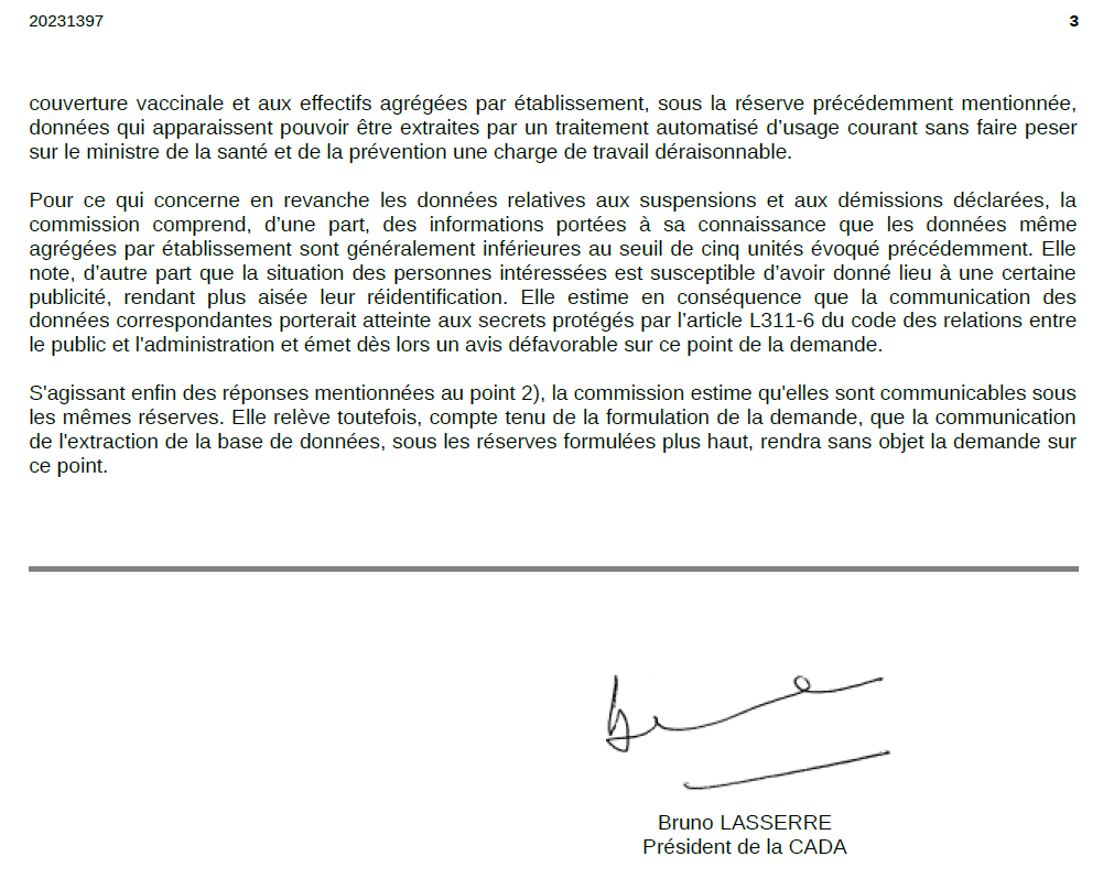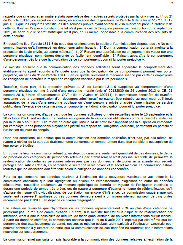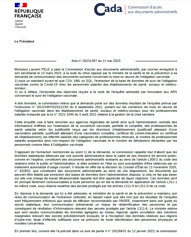 J'avais demandé au ministère ces données sur le suivi de l'obligation vaccinale le 1er novembre 2021 mais il ne m'avait jamais répondu, j'ai donc saisi la CADA le 13 mars 2023