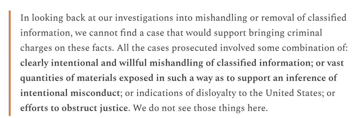So the cases brought involved "clearly intentional and willful mishandling" OR "efforts to obstruct justice," Comey said