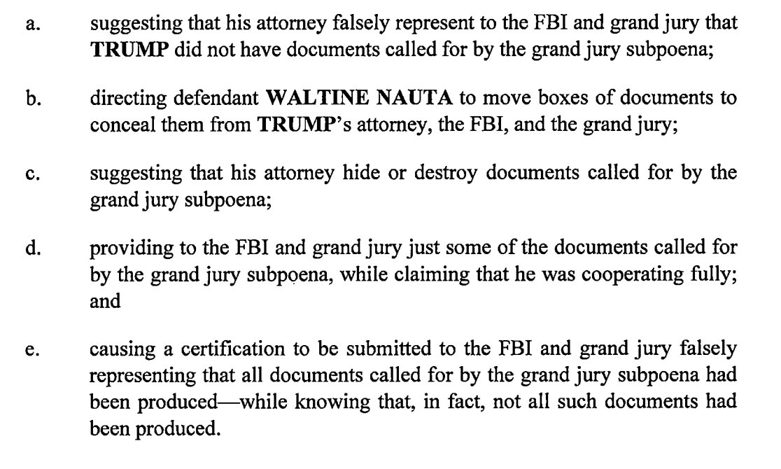 6. Further, the indictment is full of evidence Trump purposely obstructed efforts to recover the documents, including:
