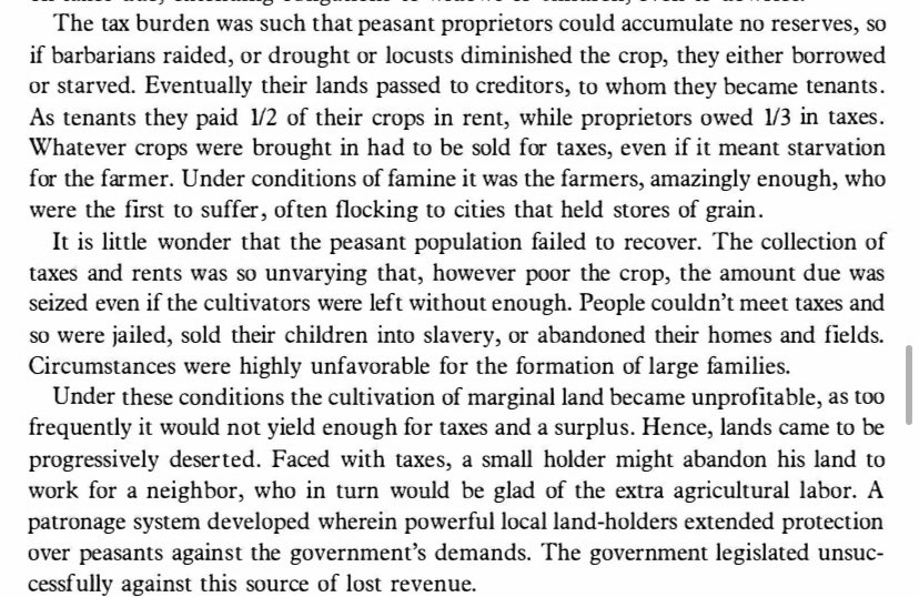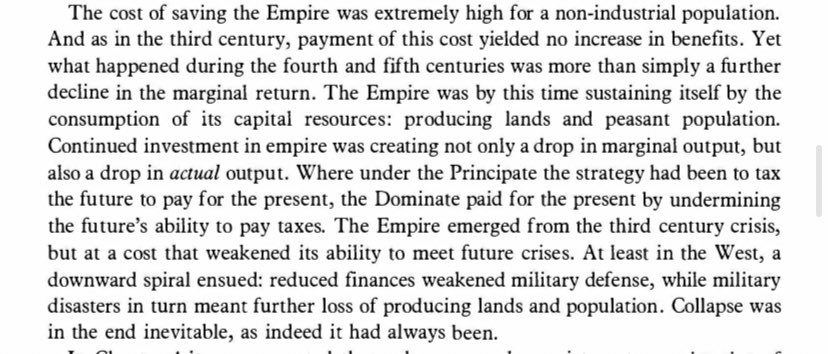 By sacrificing the productive population to raise revenue & maintain control, the Dominate started a death spiral as it needed to impoverish & alienate more & more of its citizens until there was nothing left things going. Not the army & certainly not the infrastructure.