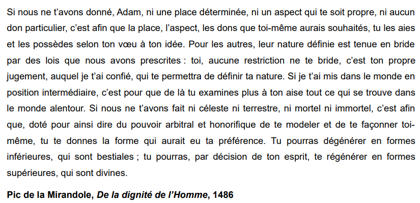 Dans «De la dignité de l’Homme», écrit en 1486, Jean Pic de la Mirandole affirme que l’homme est infiniment plastique, «ni terrestre ni céleste, ni mortel ni immortel» : comme tel, il peut s’élever jusqu’à atteindre une forme de perfection divine. 14/25
