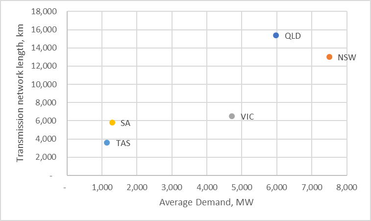 One more tweet: SA has a lot of transmission network relative to its demand. That explains a lot of why its transmission costs are high, along with it 'peaky' demand profile. But as explained in tweet #3, transmission costs are substantially lower than distribution costs.