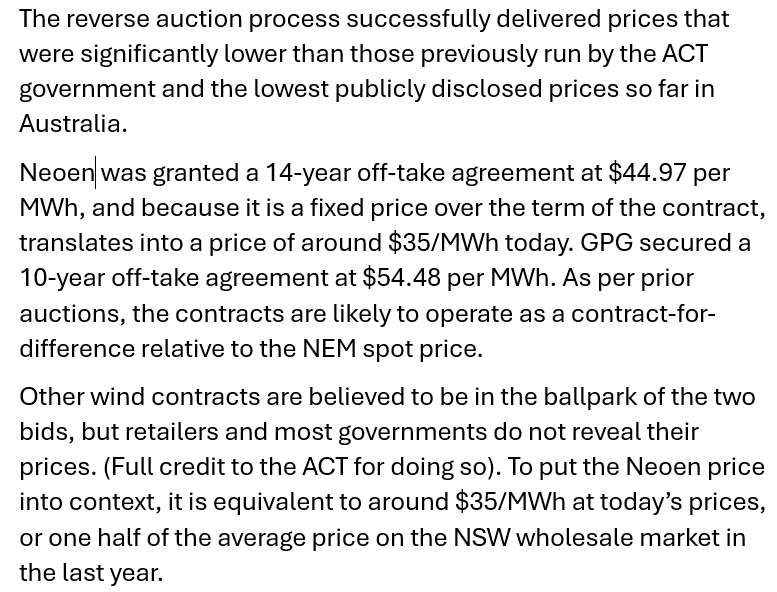 Back in 2020, the ACT Government signed contracts for difference (CfDs) with 2 wind farms, Berrybank & Goyder Sth. The CfD strike prices were $54.48 & $44.97/MWh respectively.