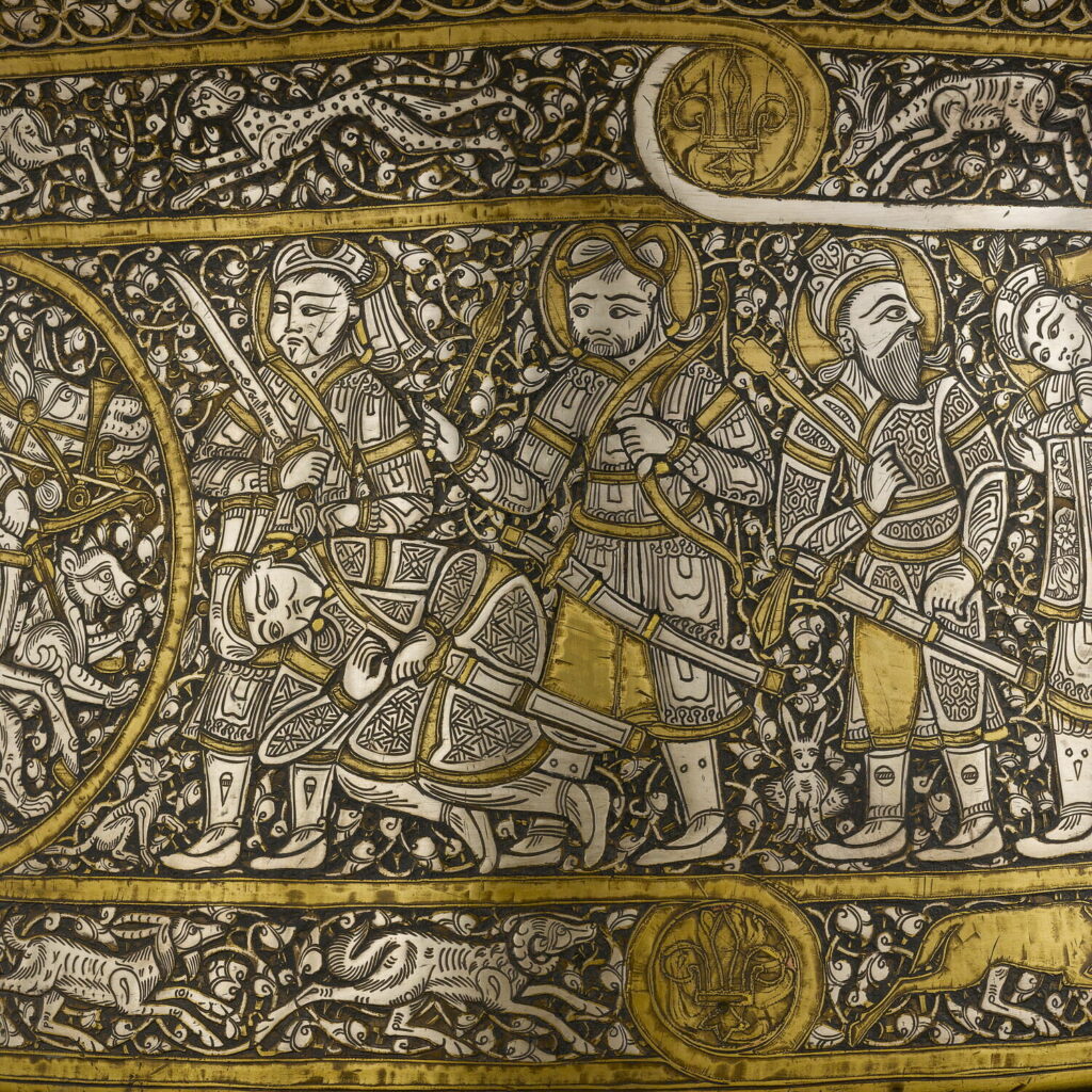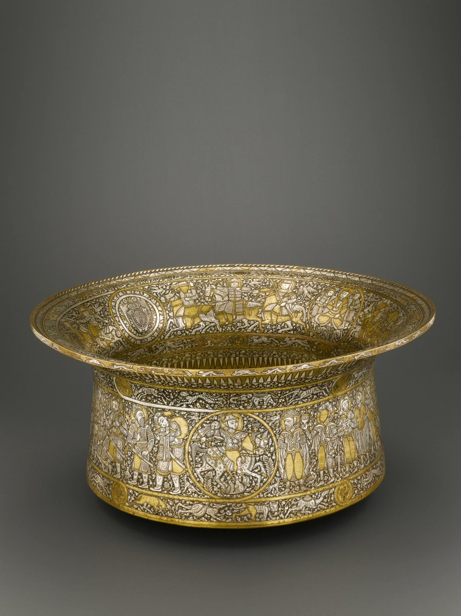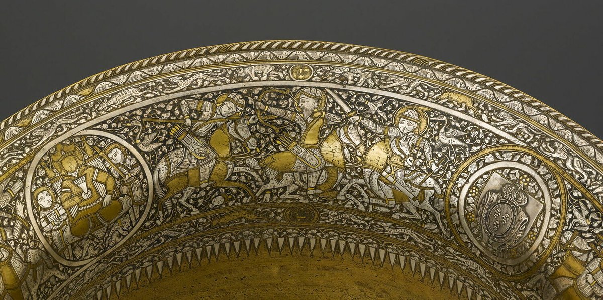 Made from brass and inlaid with gold and silver, it portrays an incredibly complex, unbroken scene of princes hunting and fighting, alongside exotic animals and floral decoration.