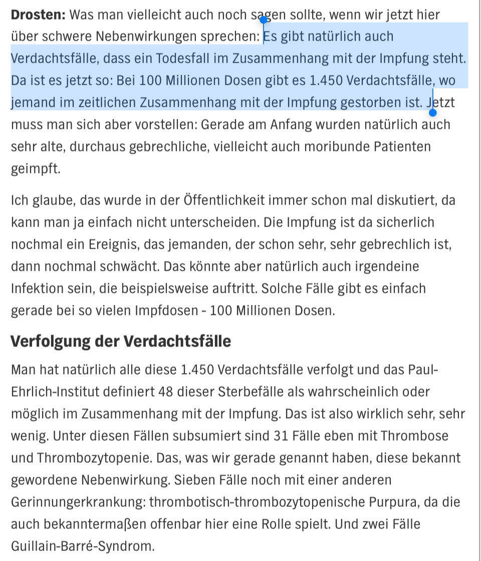Ausdrücklich hatte sich Drosten hierin auch zu den dem PEI gemeldeten Todesfällen nach der Covid-Impfung geäußert.