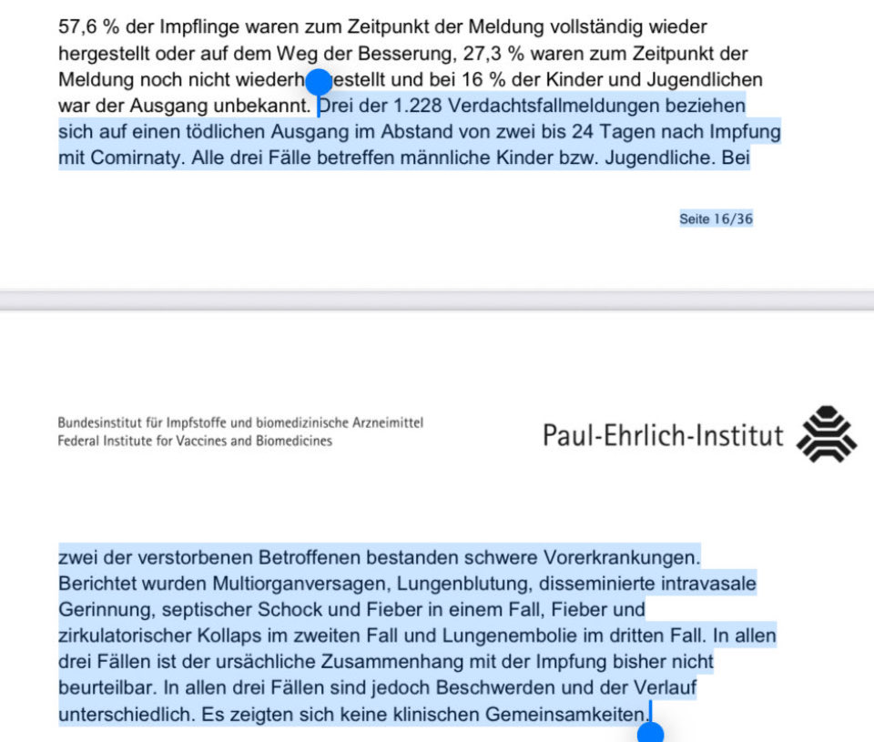 Am 07.02.22 (Ereignisse bis 31.12.21) war im PEI-Sicherheitsbericht (S. 17) dann übrigens schon die Rede von ACHT Verdachtsfallmeldungen mit tödlichem Ausgang bei Kindern nach der mRNA-Covid-Impfung mit Comirnaty (BioNTech).