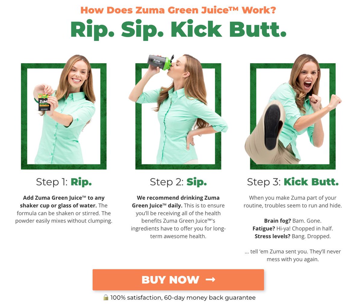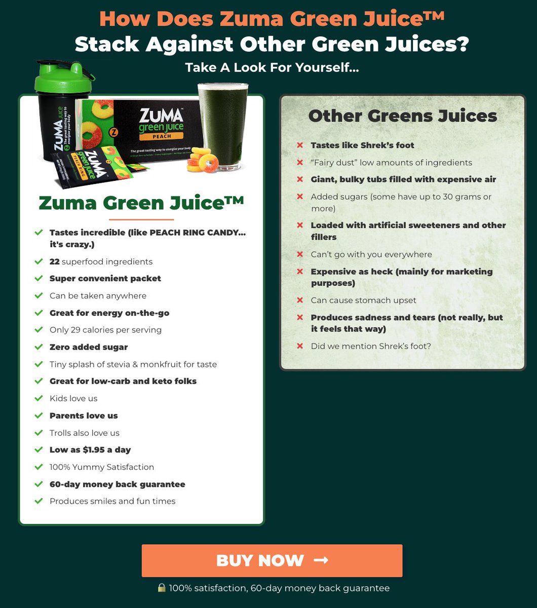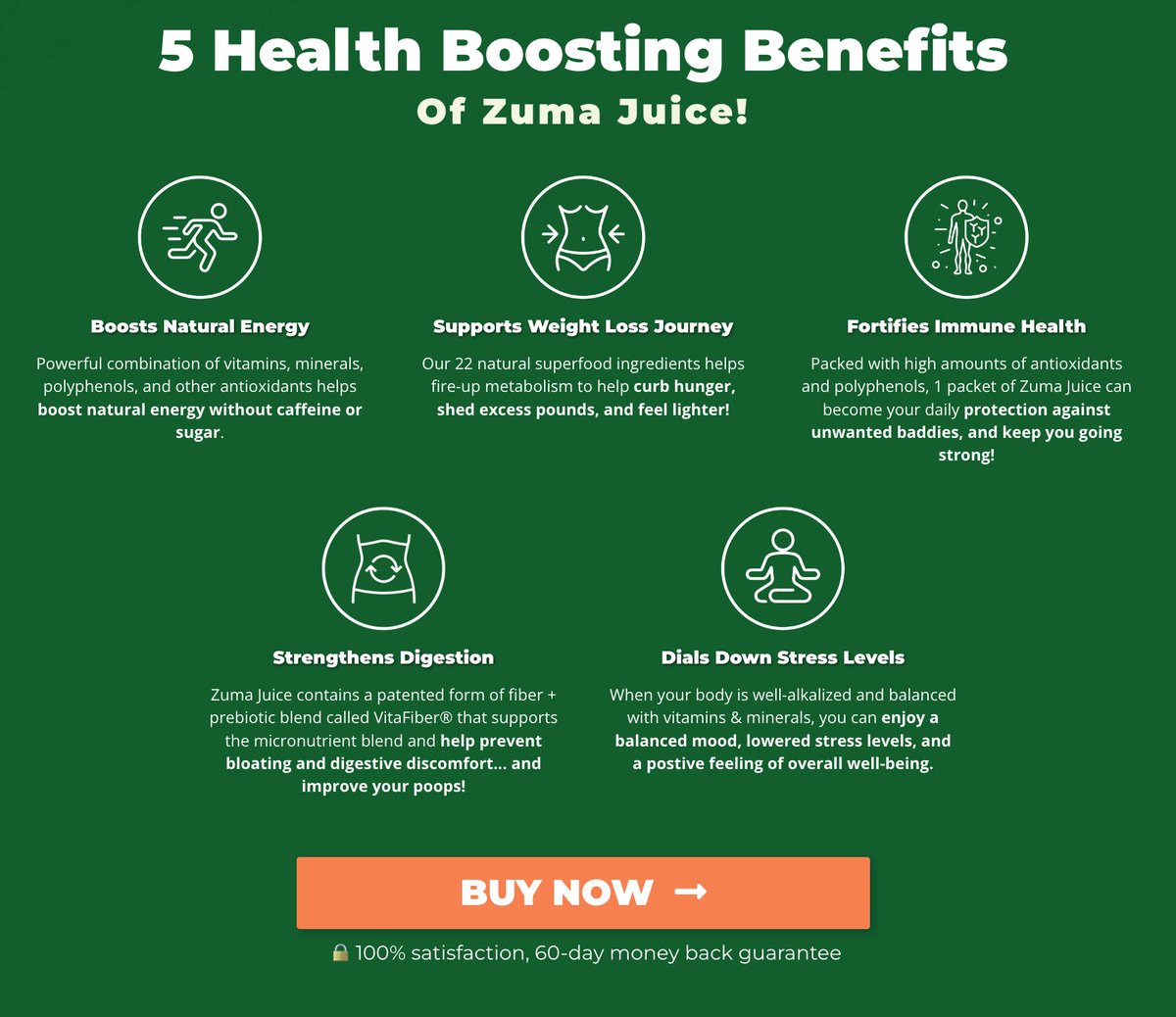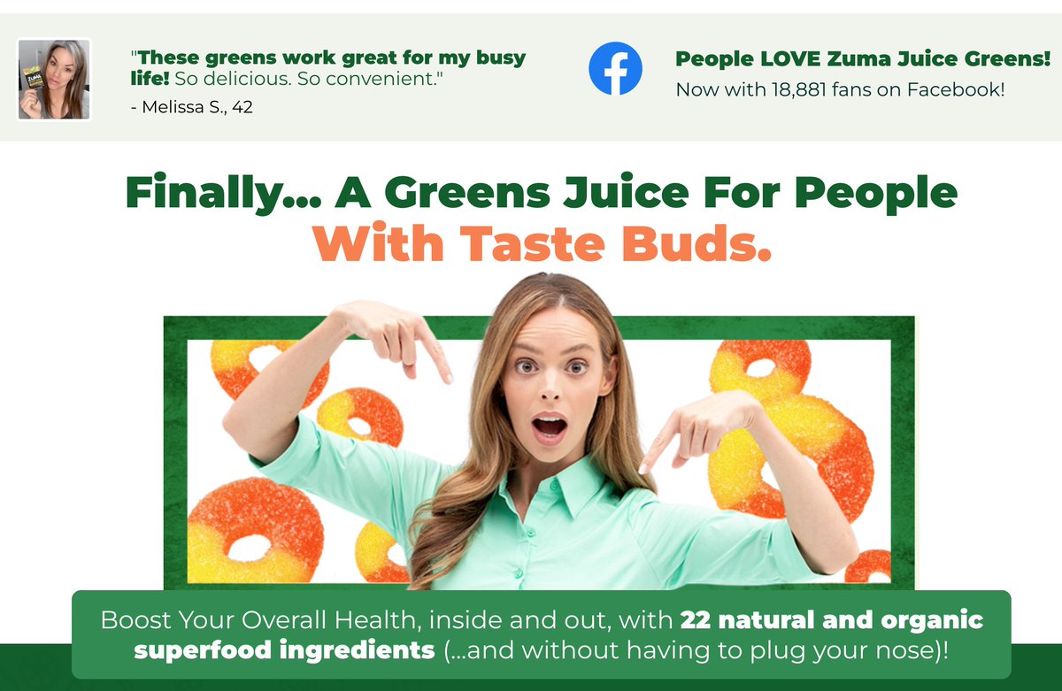 Zuma Juice uses a solution-aware headline highlighting the product's 3 main benefits.