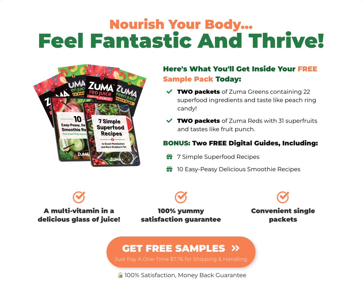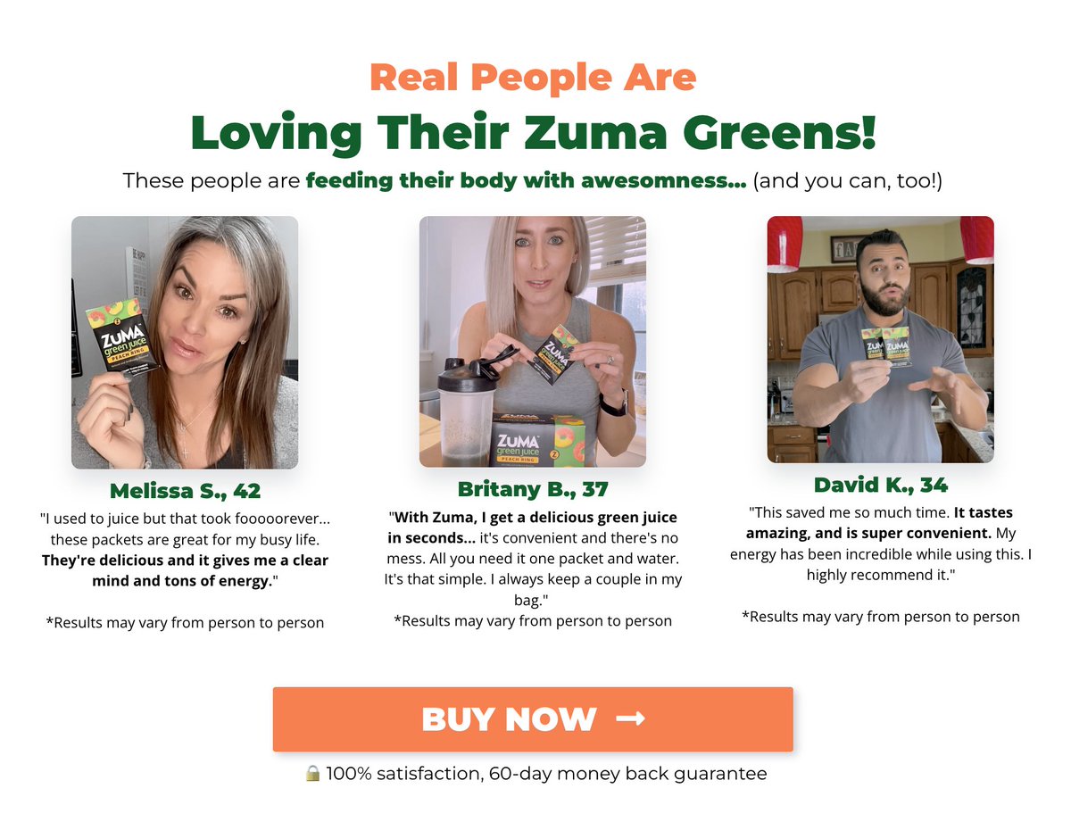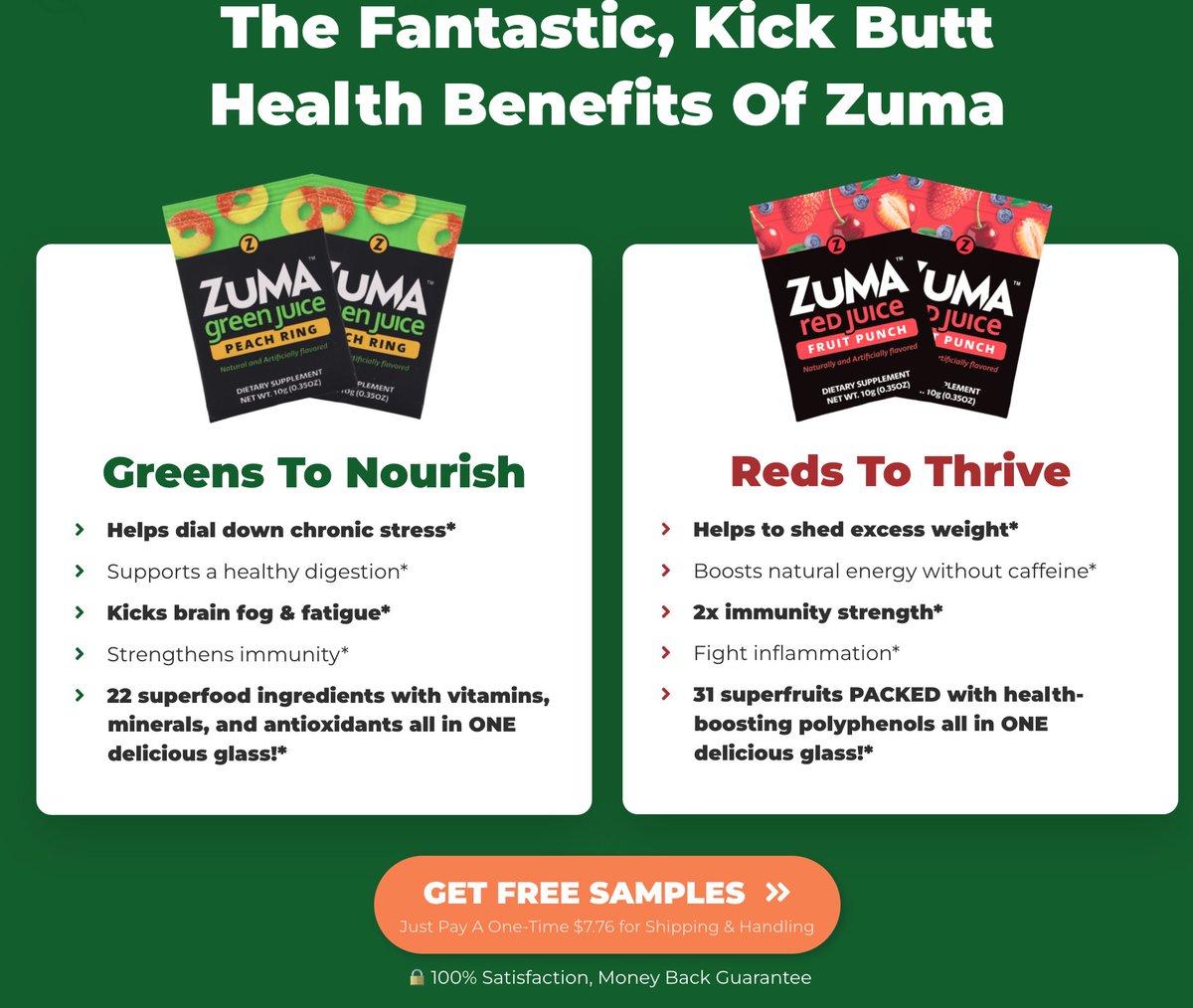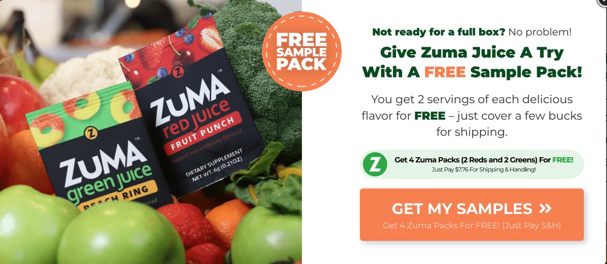 Zuma Juice uses a solution-aware headline highlighting the product's 3 main benefits.