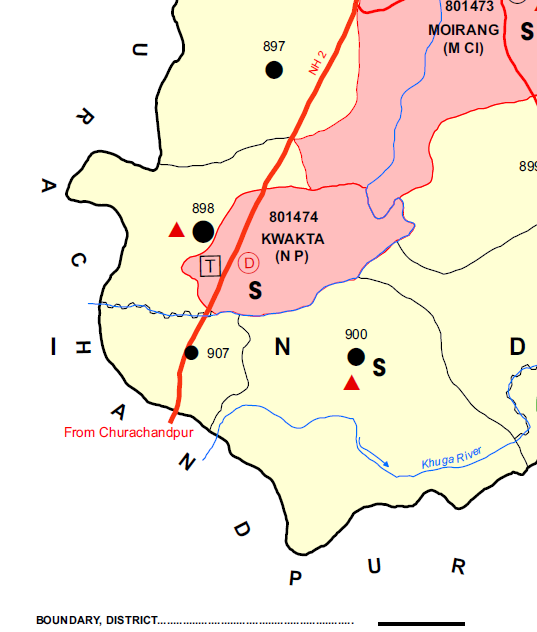 Nobody knows where the district borders are. None of the maps I have seen agree with each other. Here is the Survey of India map from the Chandel district census handbook.