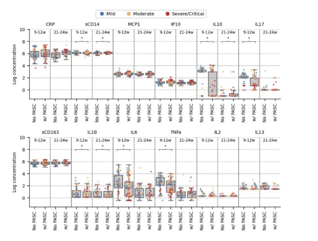 3) Log-concentrations of inflammatory markers at 9-12 and 21-24 weeks after Illness onset among RECOVERED study participants with and without PASC