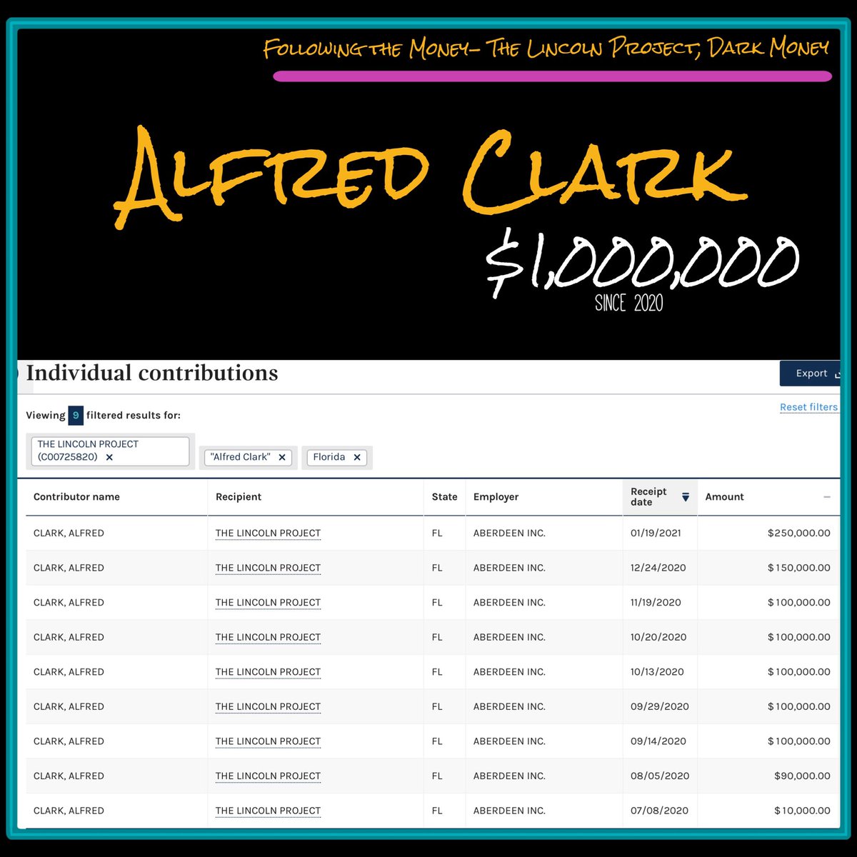 6/ Though I can find little to no information on him, I decided to add Alfred Clark to the thread. He has donated $1,000,000 to The Lincoln Project since 2020.