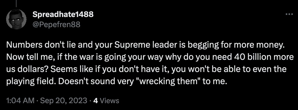 1. Every month the "market rate" for new russian recruits rises exponentially. Cheap, gullible soldiers are already dead. Remaining men understand how few of them will return alive to spend their money.