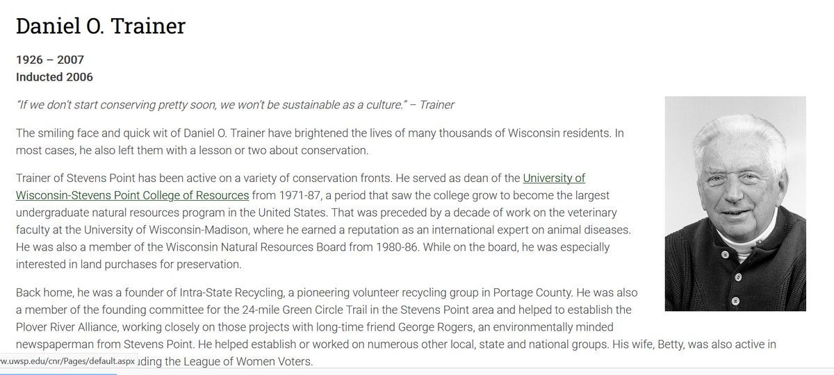 Daniel Trainer of Stevens Point .. served as dean of the University of Wisconsin-Stevens Point College of Resources from 1971-87, a period that saw the college grow to become the largest undergraduate natural resources program in the US