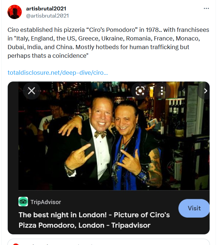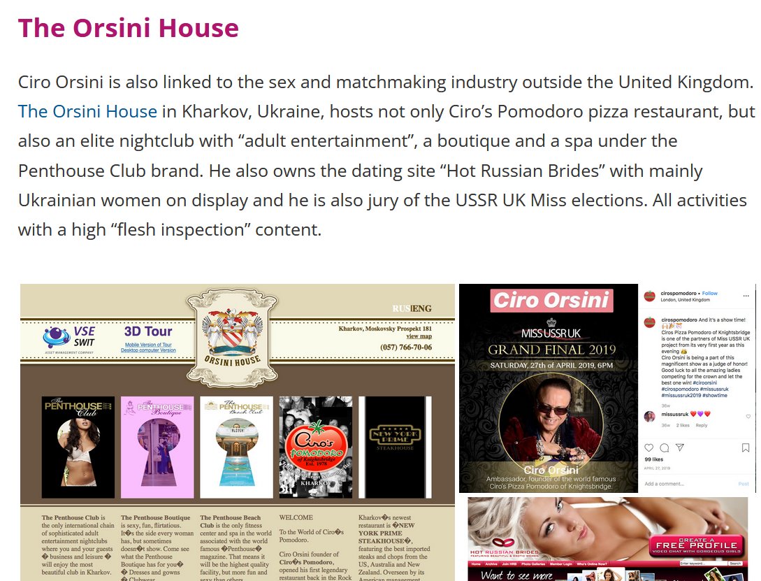 "Ciro Orsini is also linked to the sex and matchmaking industry outside the UK. The Orsini House in Kharkov, Ukraine, hosts not only Ciro’s Pomodoro pizza restaurant, but also an elite nightclub with “adult entertainment”, a boutique and a spa under the Penthouse Club brand."..