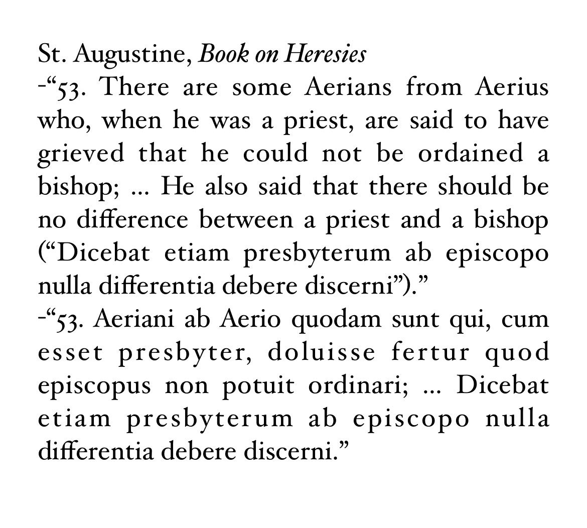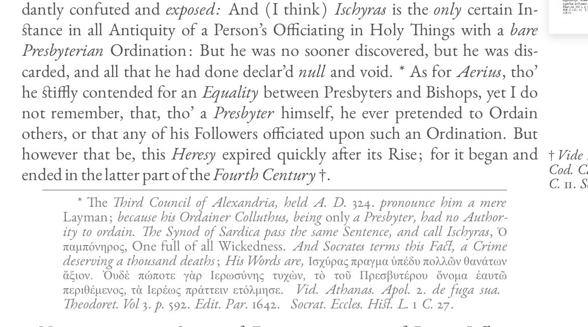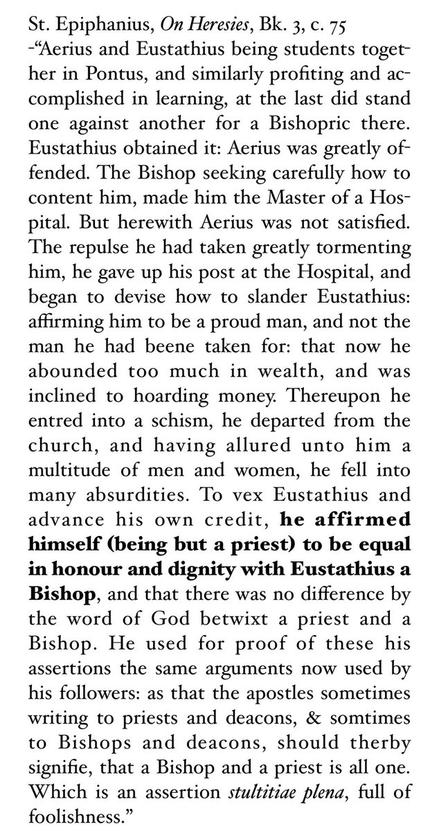 It begins with the ancient heresies of Aerius, Thebulis, Ischyras, the first ones to claim parity between bishop and presbyter, and that presbyters could ordain: