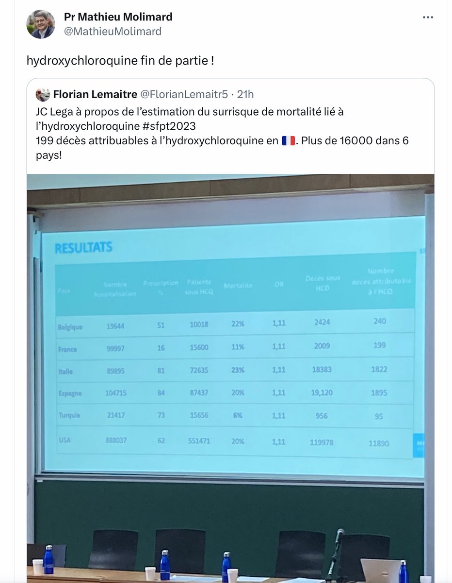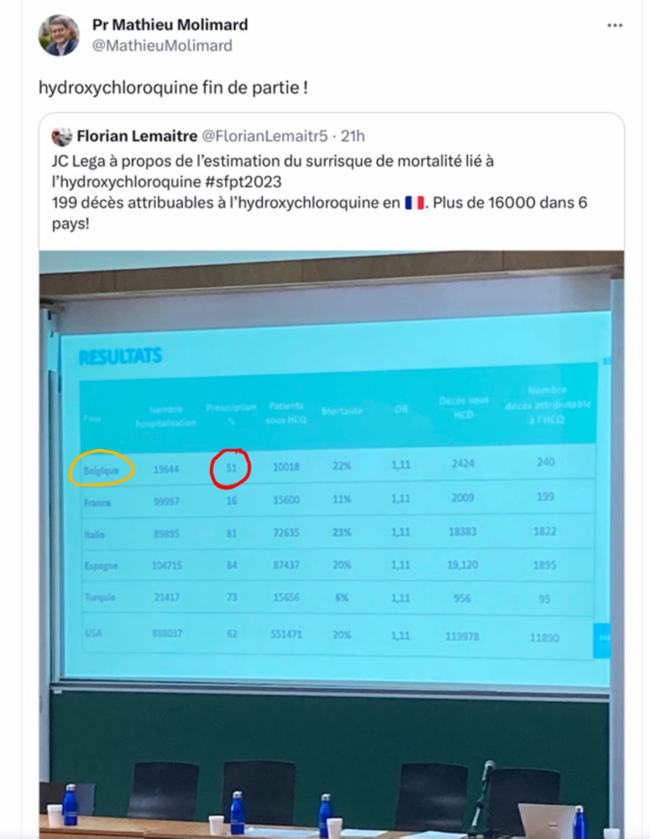 Selon les auteurs, il y aurait eu 240 décès attribuables à l’HCQ En Belgique. Pourtant, l’étude belge (se basant sur les chiffres réels), a démontré une nette diminution de la mortalité chez les patients hospitalisés
