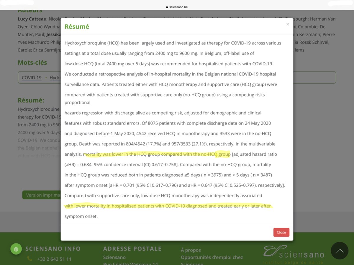 2/n ayant reçu l’HCQ par rapport aux patients n’ayant pas reçu d’HCQ... Cette étude est mentionnée sur le site officiel de Sciensano