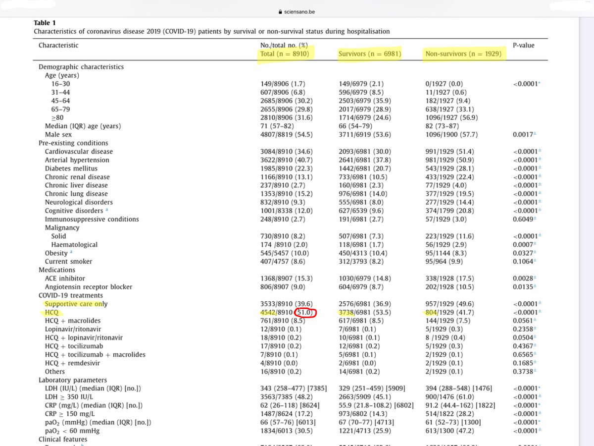 2/n En réalité, il y a eu 51% de prescription d’HCQ sur 8910 personnes de l’étude : soit 4542 personnes sous HCQ et 39,6 % de ces 8910 ont juste reçu des soins de support soit 3533 personnes.