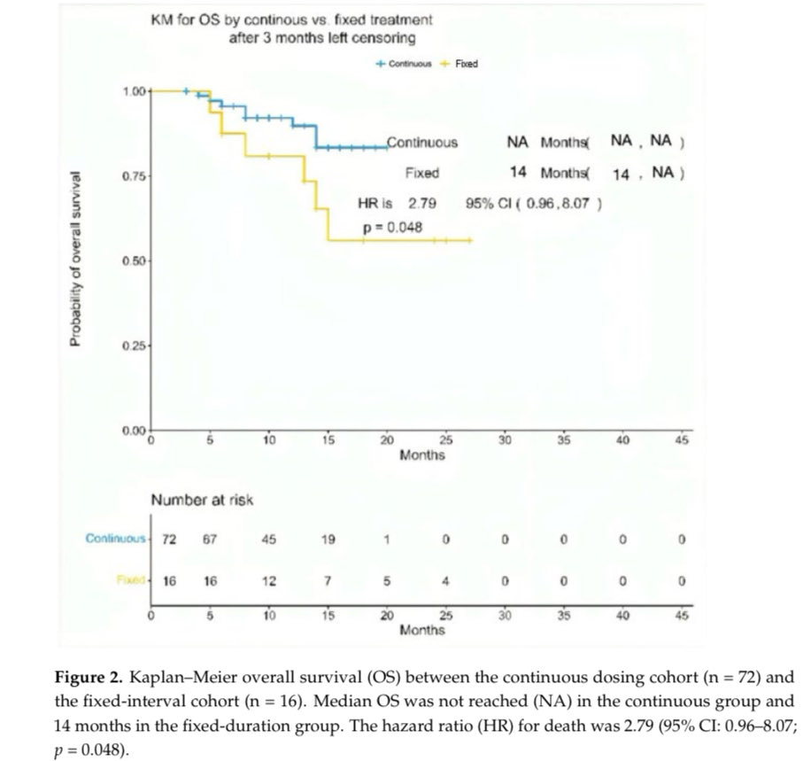 📈 12-mo PFS ~same: 65% (continuous) vs. 66% (fixed)