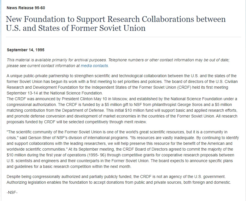 Back in 1995, a new foundation was announced in Moscow by Bill Clinton called CRDF (U.S. Civilian Research and Development Foundation for the Independent States of the Former Soviet Union).