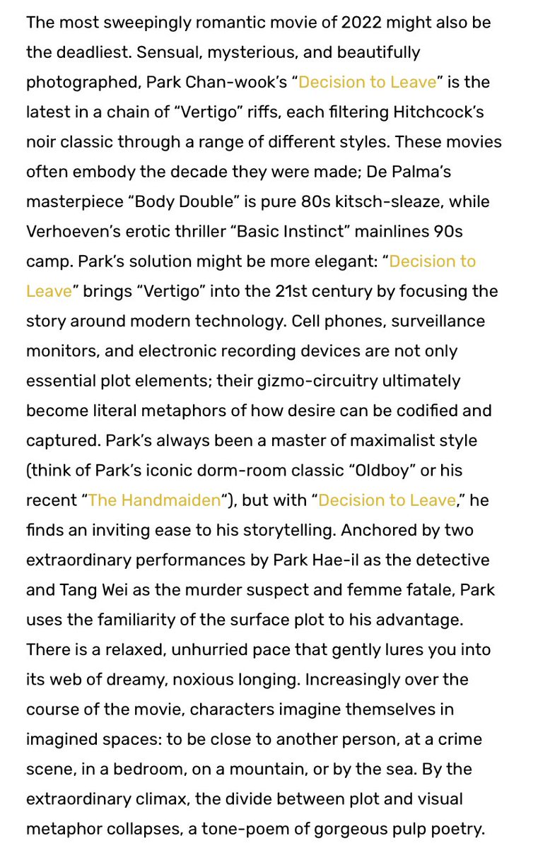 I loved DECISION TO LEAVE. It made my top ten last year, including a screenshot of the excerpt in the tweet and link to the full piece here: