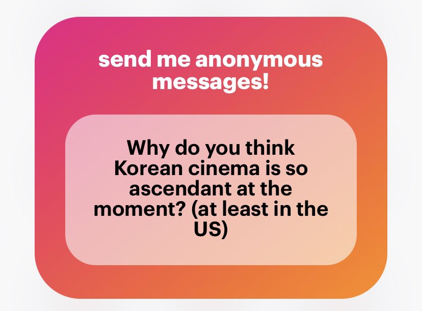 Korean cinema has been a huge cultural import for 20 years. They make a lot of subversive, stylistically daring genre movies that deal with heavy and often universal themes, and more recently, class struggle. There’s an easy accessibility there not all international cinema has.