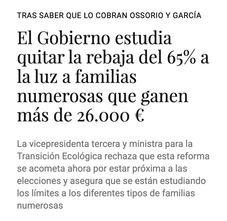 El Gobierno, tras saber del caso, anuncia que "estudia" eliminar la rebaja del 65% a la energía eléctrica doméstica establecida para aquellas familias numerosas que tengan ingresos superiores a 26.000€.
