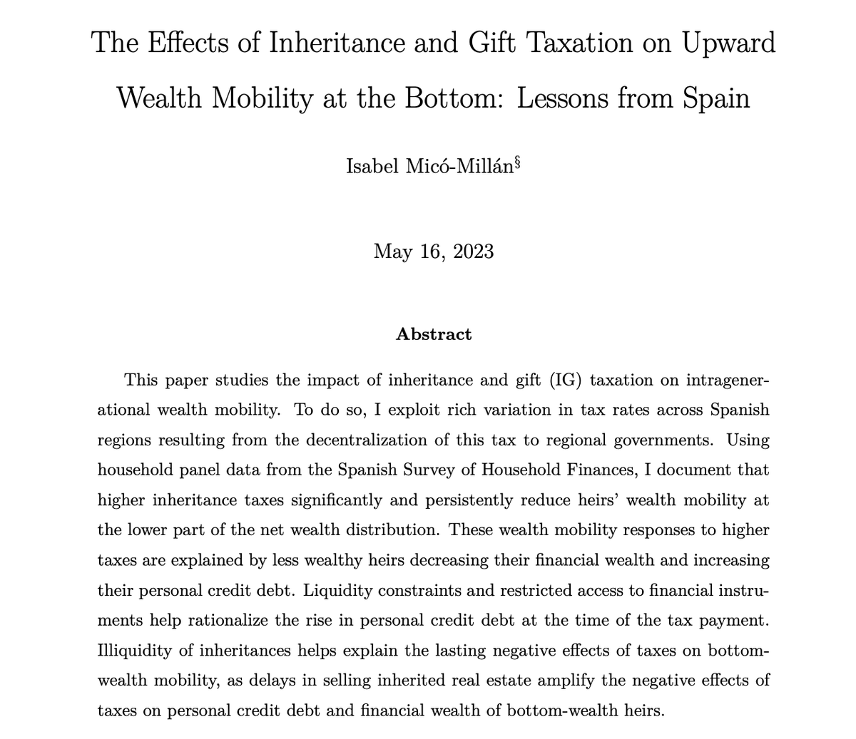 Un artículo de la recién defendida tesis doctoral de @isabelmicom (¡Felicidades por ello, Isabel!), en la que analiza los cambios en el impuesto de sucesiones en cada Comunidad Autónoma entre 2002 y 2018, lo que le permite evaluar los efectos del tributo: