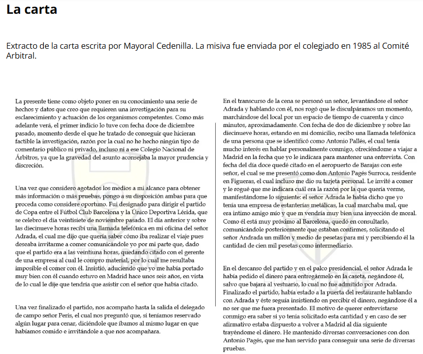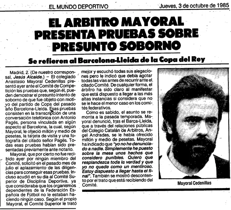 El colegiado Mayoral Cedenilla, envió un "dossier" completo al CTA, con nombres, fotos y grabaciones denunciando un intento de soborno de Antoni Pagès, hombre de confianza de Núñez, "para asegurar el pase del Barça".