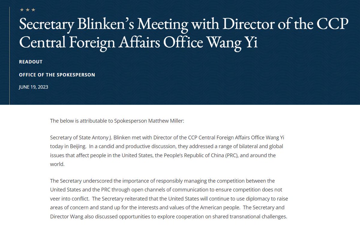 Według odczytu stronu chińskiej🇨🇳 Blinken🇺🇸 miał powiedzieć, że nie popierają „niepodległości 🇹🇼Tajwanu”, i nie dąży do konfliktu z 🇨🇳Chinami, a 🇺🇸USA zobowiązały się do powrotu do programu ustalonego przez Biden i Xi na Bali w listopadzie 2022 roku. 11/