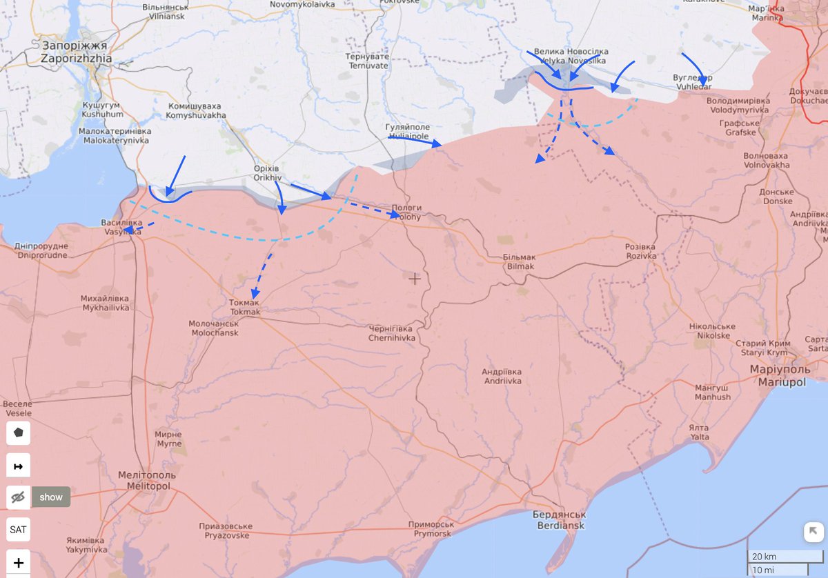 В двух местах — в районе Каменского и Большой (Великой) Новоселки ВСУ удалось вклиниться в первую линию обороны российской армии. А вот в районах Работино (направление на Токмак) и Новопокровки (на Пологи) заметного продвижения нет. 3/