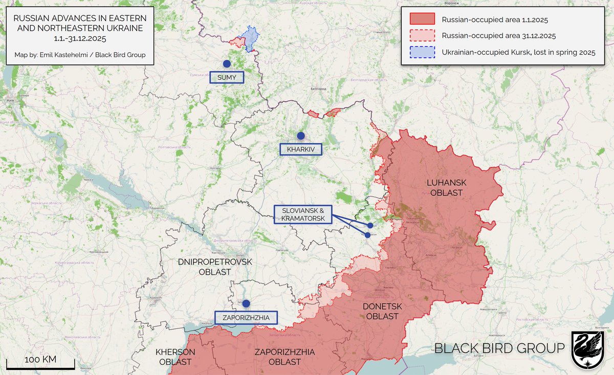 First, some numbers. Russia took under 4,600 km² of Ukrainian territory in 2025, compared to roughly 3,500 km² in 2024.