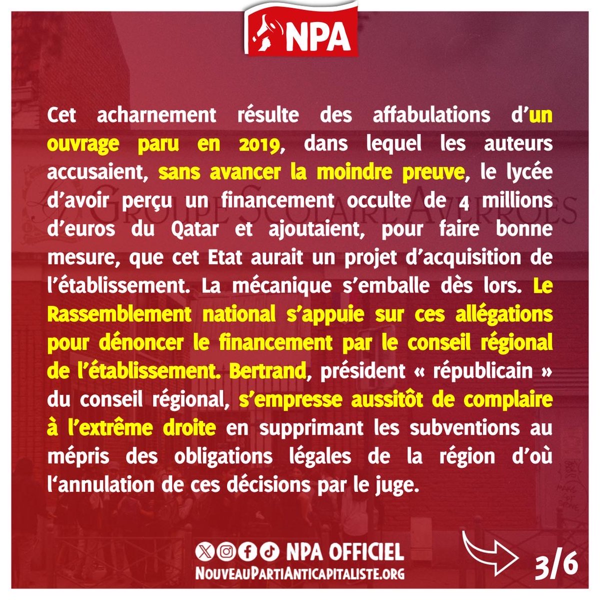 Cet acharnement résulte des affabulations d'un ouvrage paru en 2019, dans lequel les auteurs accusaient, sans avancer la moindre preuve, le lycée d'avoir percu un financement occulte de 4 millions d'euros du Qatar. 3/6