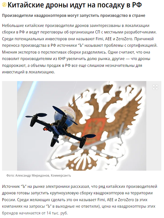 1/ Russia's Kommersant publication: China's small-scale drone manufacturers are interested in localizing UAV assembly in Russia and are negotiating a joint venture with local developers. Among potential investors are Fimi, AEE and ZeroZero. kommersant.ru/doc/6053996