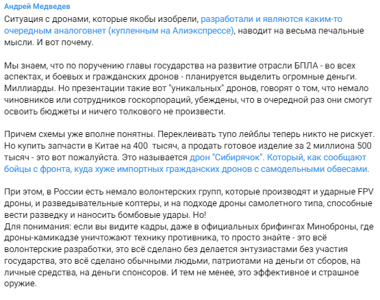 3/ From the Telegram post: "The situation with drones, which were allegedly invented, developed and are some kind of "no other analogues exist"-type (actually bought on AliExpress), leads to very sad thoughts. And this is why."