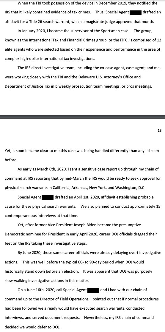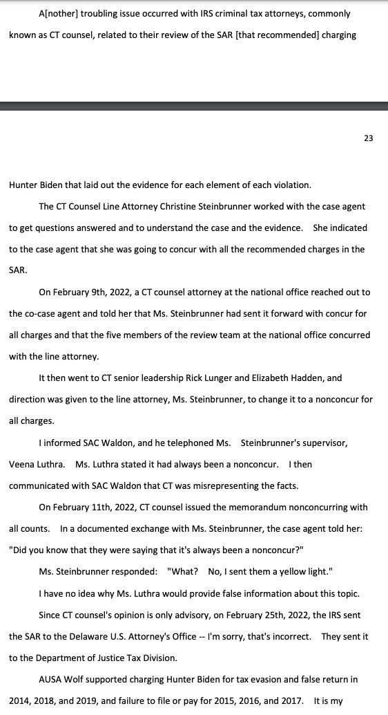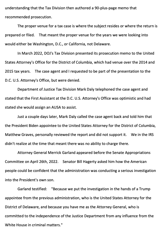"the criminal tax investigation of Hunter Biden, led by the United States Attorney's Office for the District of Delaware, has been handled differently than any investigation I've ever been a part of for the past 14 years of my IRS service" waysandmeans.house.gov/wp-content/upl…